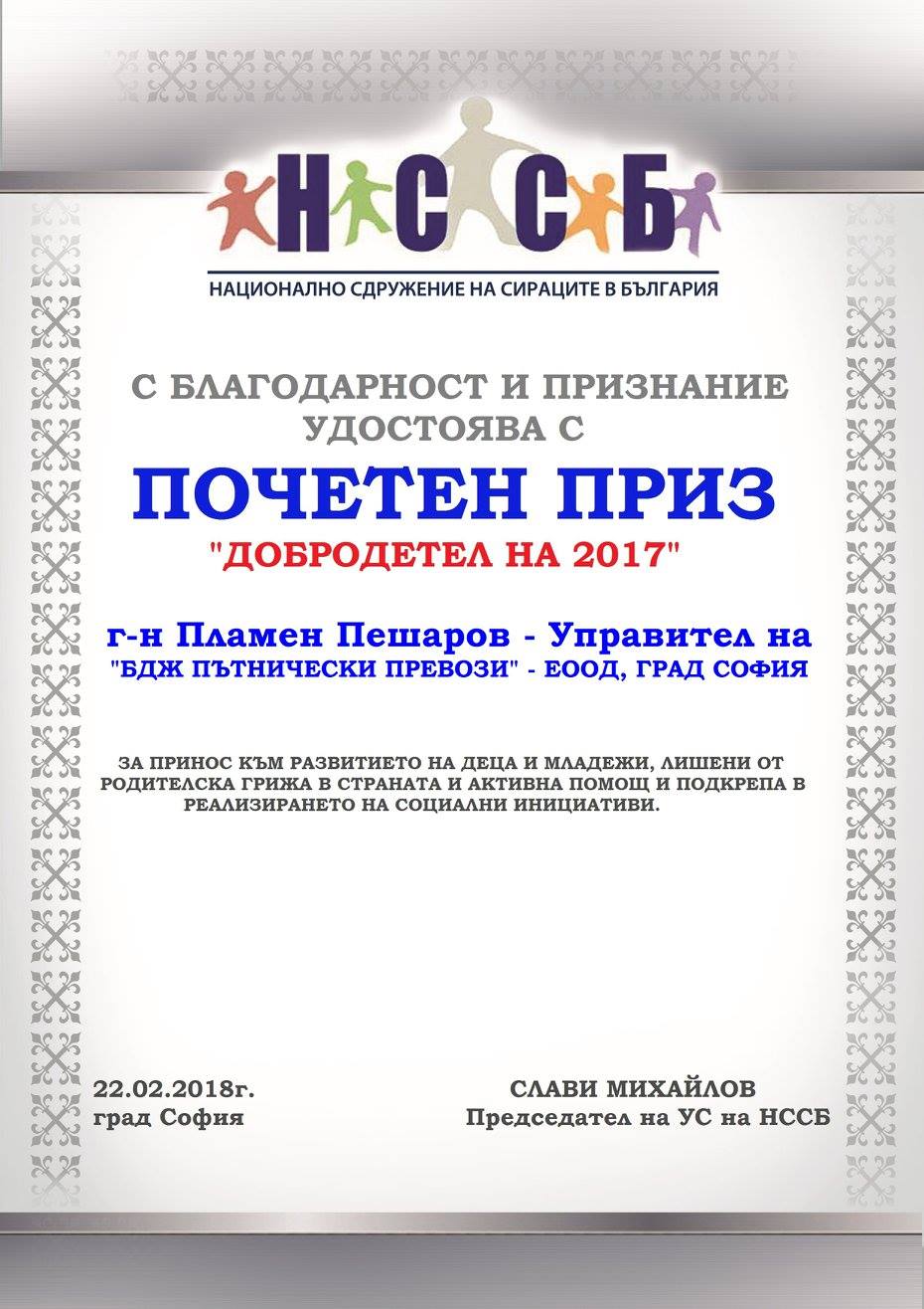 /КРОСС/ Днес, 22 февруари, на официална церемония в Централния военен клуб управителят на „БДЖ - Пътнически превози" ЕООД Пламен Пешаров получи приз „Добродетел на 2017 г.". Събитието се организира за втора поредна година от Националното сдружение на сираците в България (НССБ).