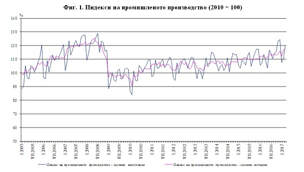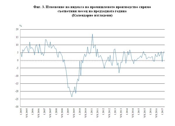 През март 2017 г. при календарно изгладения индекс на промишленото производство е регистриран ръст от 5.9% спрямо съответния месец на 2016 година.