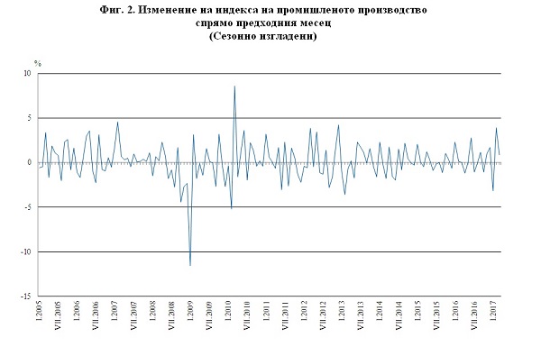 През март 2017 г. увеличение спрямо предходния месец е регистрирано в преработващата промишленост - с 2.6%, а намаление е отчетено в добивната промишленост - с 5.4%, и в производството и разпределението на електрическа и топлоенергия и газ - с 6.8%.