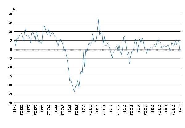 През януари 2017 г. при календарно изгладения индекс на промишленото производство е регистриран спад от 1.2% спрямо съответния месец на 2016 година.