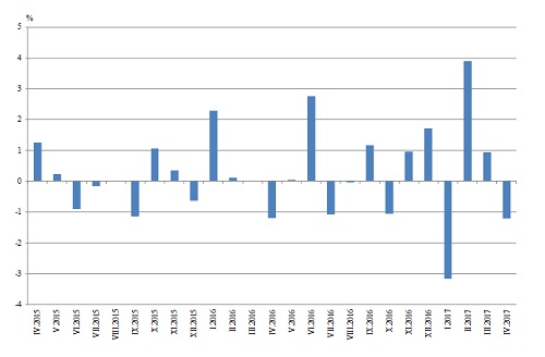 През април 2017 г. намаление спрямо предходния месец е регистрирано в добивната промишленост - с 2.9%, и в преработващата промишленост - с 1.7%, а увеличение е отчетено в производството и разпределението на електрическа и топлоенергия и газ - с 3.6%.