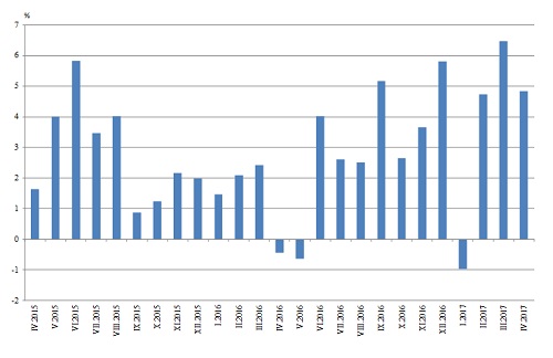 През април 2017 г. при календарно изгладения индекс на промишленото производство е регистриран ръст от 4.8% спрямо съответния месец на 2016 година.