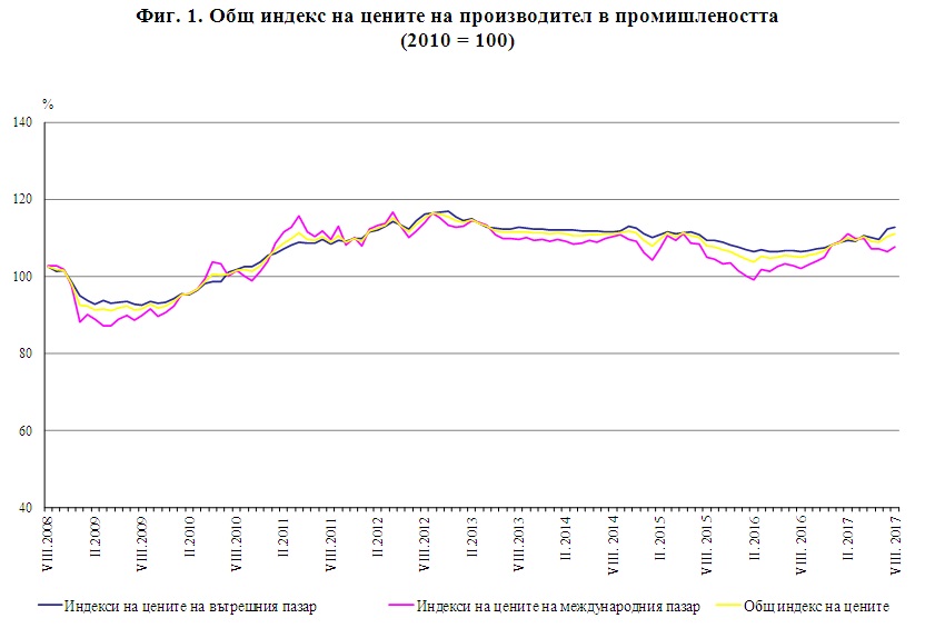 Общият индекс на цените на производител през август 2017 г. нараства с 0.7% спрямо предходния месец. По-високи цени са регистрирани в добивната промишленост - с 2.1%, в преработващата промишленост - с 0.7%, и при производството и разпределението на електрическа и топлоенергия и газ - с 0.5%.