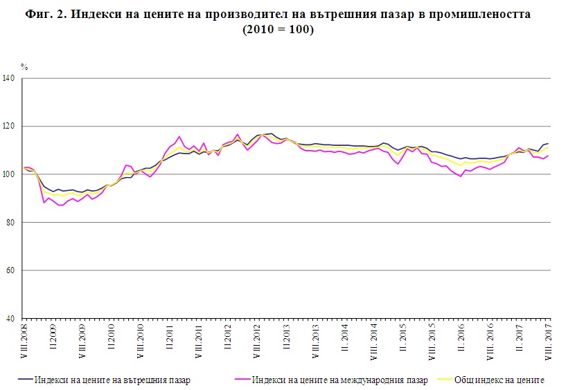 Индексът на цените на производител на вътрешния пазар през август 2017 г. нараства с 5.9% в сравнение със същия месец на 2016 година. Увеличение на цените е регистрирано при производството и разпределението на електрическа и топлоенергия и газ - с 10.4%, в добивната промишленост - с 9.0%, и в преработващата промишленост - с 3.1%.