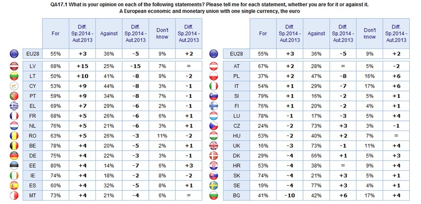 Подкрепата за еврото нараства. Литва се готви да приеме единната валута на Европа и ние сме свидетели на увеличение от 10 процентни пункта (от миналата есен насам) на броя на литовците, които заявяват, че подкрепят еврото. Подобни тенденции наблюдаваме в цяла Европа: увеличение с десет процентни пункта в Латвия и Кипър и с пет процентни пункта в Португалия и Гърция.