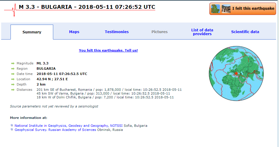 /КРОСС/ Земетресение с магнитуд 3,3 по скалата на Рихтер е регистрирано на територията на България близо до Провадия, информира Европейският сеизмологичен център.