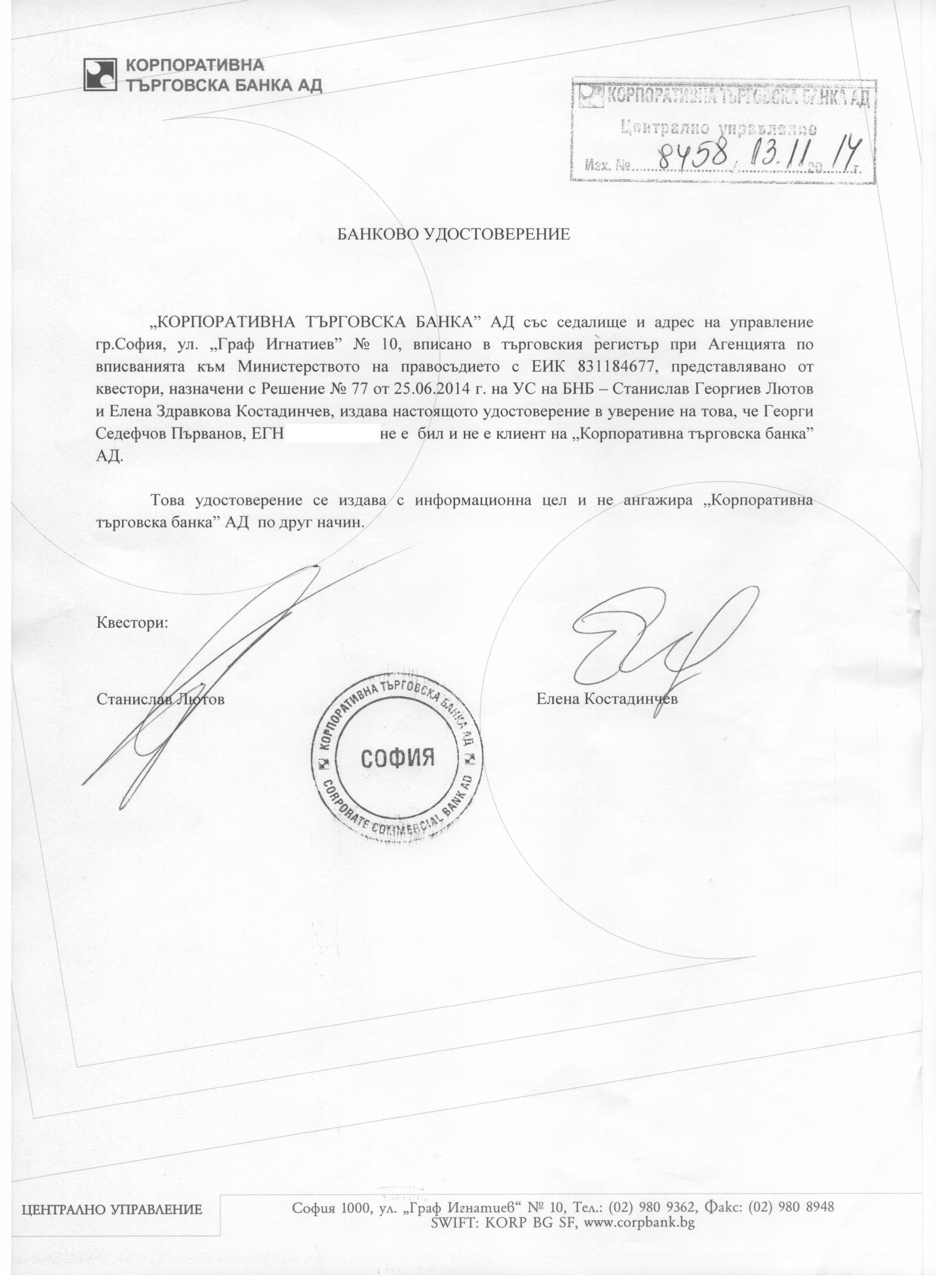 /КРОСС/ Георги Първанов не е бил и не е клиент на „Корпоративна търговска банка" АД, уверяват квесторите на банката Станислав Лютов и Елена Костадинчев.