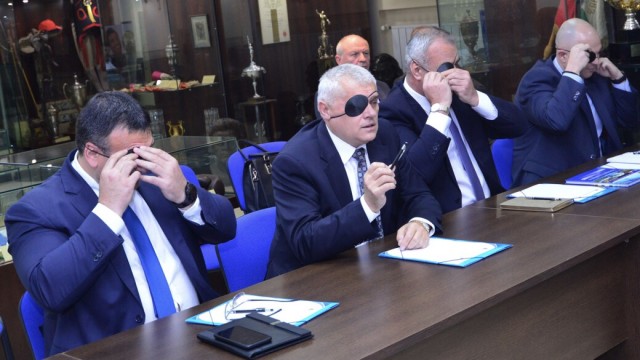 /КРОСС/ Министърът на вътрешните работи Валентин Радев пристигна на срещата на националния стадион "Васил Левски", на която се обсъждат мерки за справяне с футболното хулиганство, с превръзка на окото.