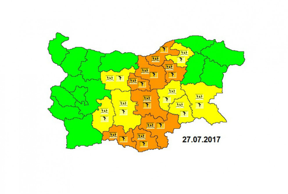 За областите Ловеч, Пловдив, Пазарджик, Разград, Сливен, Ямбол и Бургас е обявен жълт код. Очакваните количества дъжд за тези области са между 15 и 30 л/кв.м, а в отделни райони - и повече.
