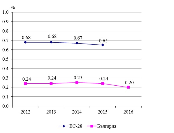 Делът на бюджетните разходи за НИРД от брутния вътрешен продукт (БВП) също намалява - през 2016 г. съставлява 0.2% от БВП при 0.24% през 2015 година. Средната стойност на този показател за Европейския съюз (ЕС-28) е 0.65% през 2015 година.