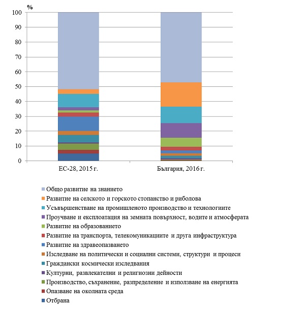 През 2016 г. структурата на бюджетните разходи за НИРД по социално-икономически цели се променя незначително спрямо предходната 2015 година. Най-голям е делът (47.2%) на държавната подкрепа за научните изследвания, насочени към „Общо развитие на знанието", което включва основно научните изследвания, осъществявани от Българската академия на науките и университетите. Тази социално-икономическа цел е основна и за Европейския съюз през 2015 г. с дял от 51.7%.