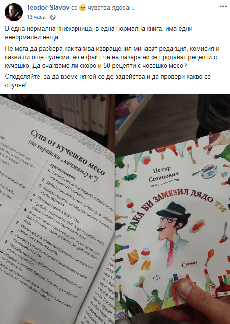В рецептата е написано най-подборно как да приготвим супата и с какво месо от куче. Информацията за книгата и шокиращата рецепта бе публикувана в социалната мрежа от Теодор Славов, който я е купил в Мол в Бургас.