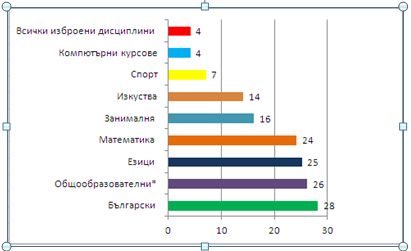 Почти две трети от учебните центрове предлагат широк набор от предмети - най-често български, математика и подготовка за матури. Чуждите езици също се предлагат в комбинация с общообразователни предмети, а в някои от центровете се добавят и изкуства и спорт. Необходимостта от подобно комбиниране се налага от пазара по чисто логистични причини - по-удобно е детето да има достъп до всички занятия на едно място, вместо родителите да осигуряват транспорт до различни части на града. (На графиката брой школи предлагащи съответната дисциплина)