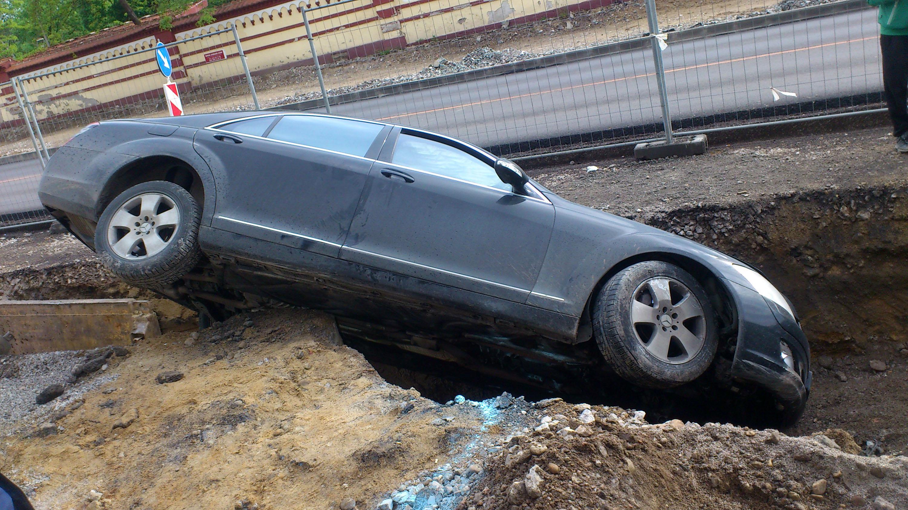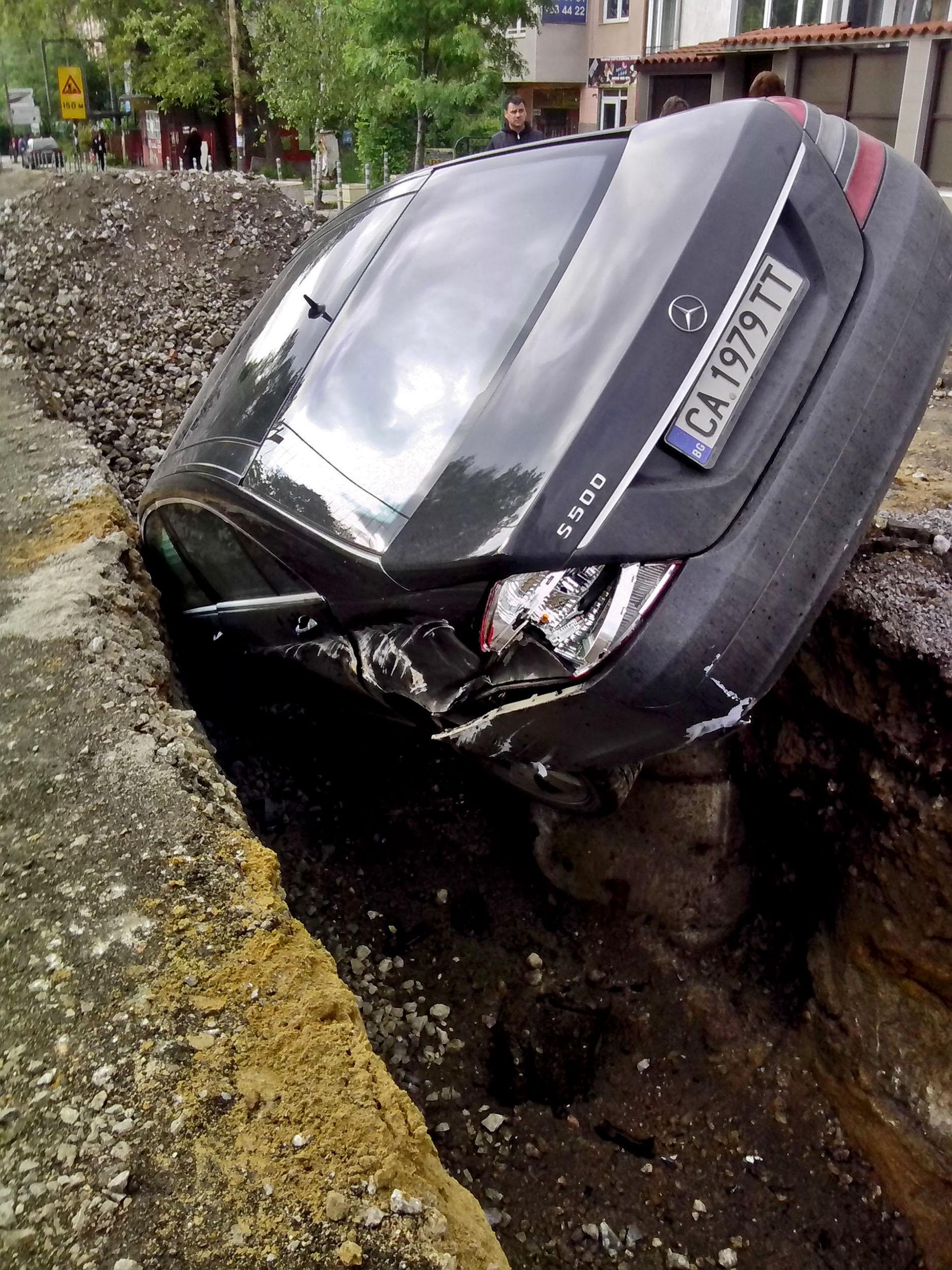 София /КРОСС/ Mercedes S 500 падна в изкопна яма пред Софийската духовна семинария "Св. Иоан Рилски".