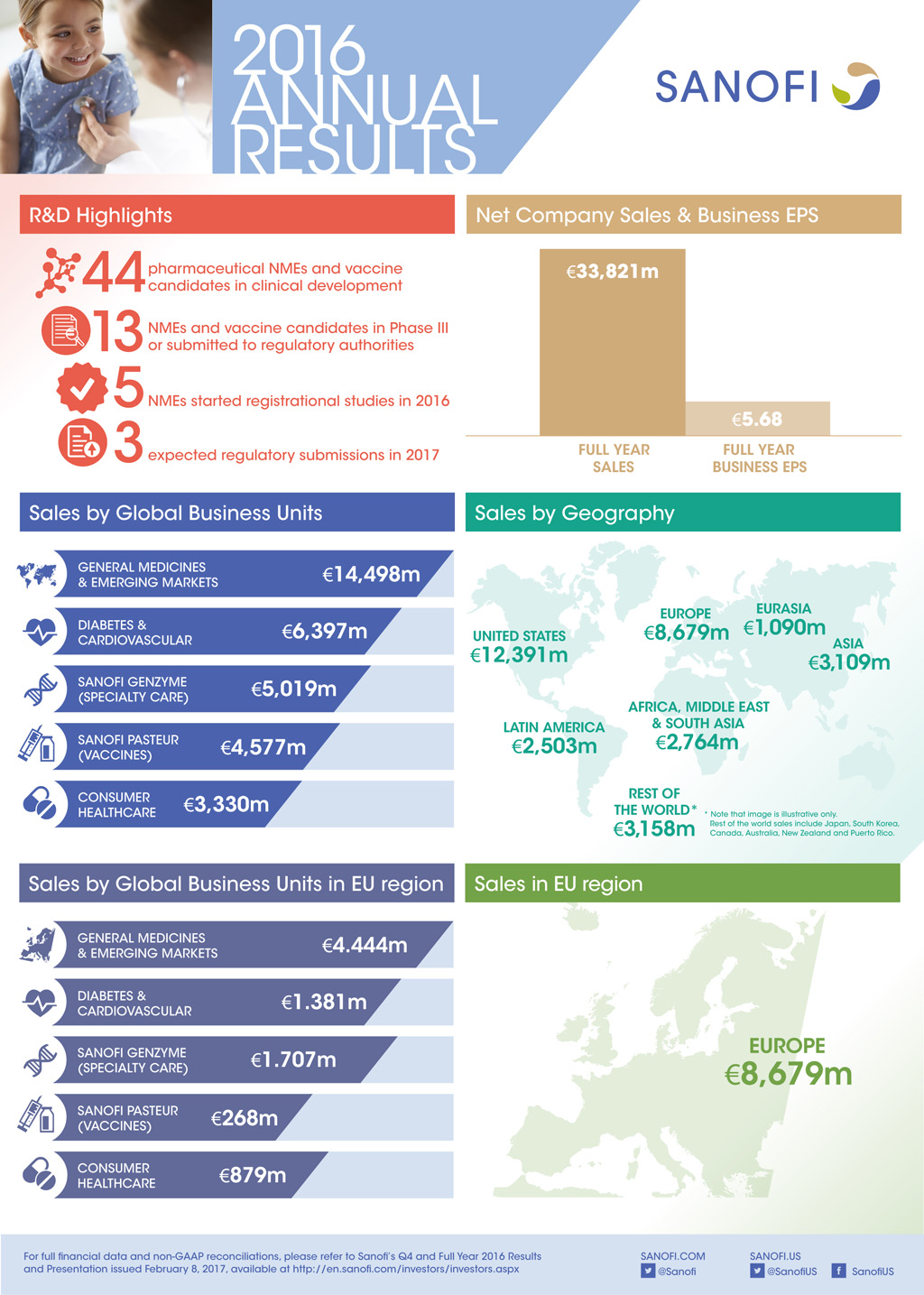 /КРОСС/ Оливие Брандикур, Главен изпълнителен директор на Sanofi коментира финансовите резултати на компанията: „2016 беше доста активна година за Sanofi, в която ние напреднахме в изпълнението на стратегическия ни план 2020. Успешно приключихме сделката за размяната на бизнеси с Boehringer Ingelheim, която ни изведе на лидерска позиция в областта на лекарствата без лекарско предписание. Добре организираната ни структура започна да дава резултат и спомогна за по-добро финансово представяне от предварителните ни очаквания. В същото време завършихме регистрирането на иновативното ни лекарство за атопичен дерматит в САЩ и Европа. Отделно, пет нови молекули вече са в регистрационна фаза."