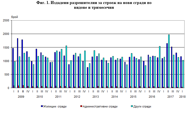 /КРОСС/ През първото тримесечие на 2018 г. местните администрации са издали разрешителни за строеж на 1 162 жилищни сгради с 6 247 жилища в тях и 815 987 кв. м разгъната застроена площ (РЗП), на 26 административни сгради/офиси с 33 101 кв. м РЗП и на 1 026 други сгради с