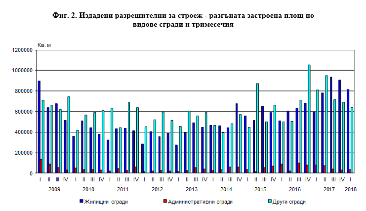 В сравнение с първото тримесечие на 2017 г. издадените разрешителни за строеж на нови жилищни сгради се увеличават с 6.3%, жилищата в тях - с 33.1%, а разгънатата им застроена площ е повече с 37.1%. Издадените разрешителни за строеж на административни и други видове сгради намаляват съответно с 10.3 и 10.1% (фиг.1), а и тяхната РЗП бележи спад респективно с 57.2 и 21.2% (фиг. 2).
