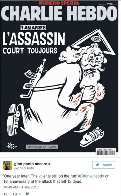 За първата годишнина от джихадисткия атентат, покосил 12 души от екипа на "Шарли Ебдо", френският сатиричен седмичник излиза днес със специален брой, на чиято първа страница е изобразен брадат бог, въоръжен с автомат „Калашников" и окървавена дреха, под заглавие: "Година по-късно убиецът продължава да шета".