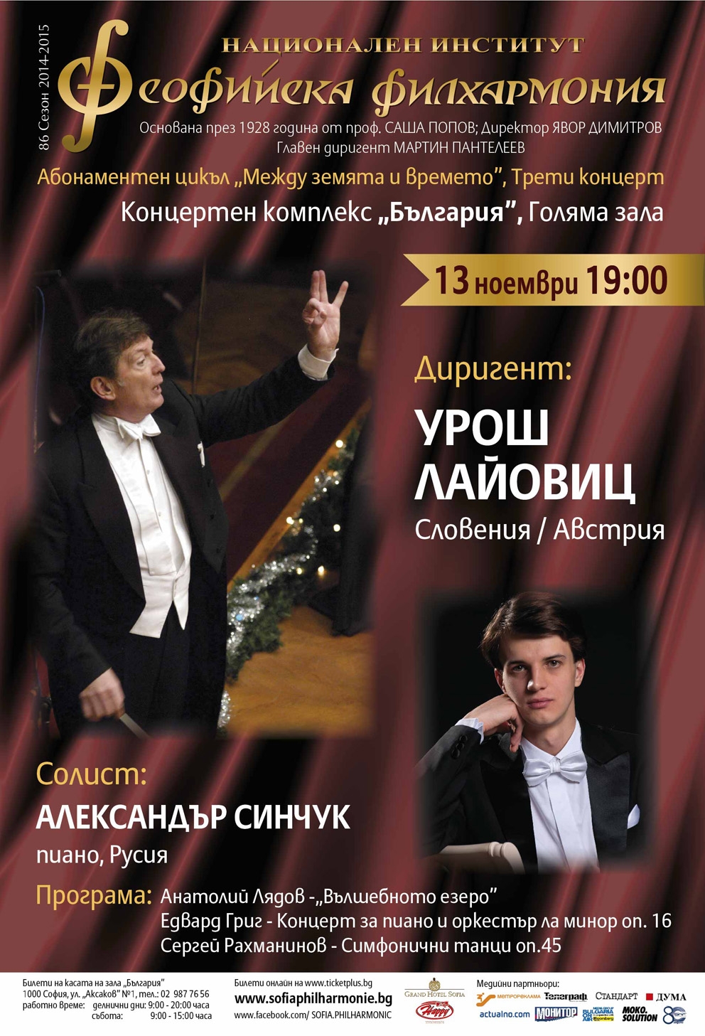 На 13 ноември от 19.00 часа в зала „ България" под виртуозната му палка и солист Алексaндър Синчук ще прозвучат произведения на АНАТОЛИЙ ЛЯДОВ с „ Вълшебното езеро", ЕДВАРД ГРИГ -Концерт за пиано и оркестър и СЕРГЕЙ РАХМАНИНОВ със своите „Симфонични танци".