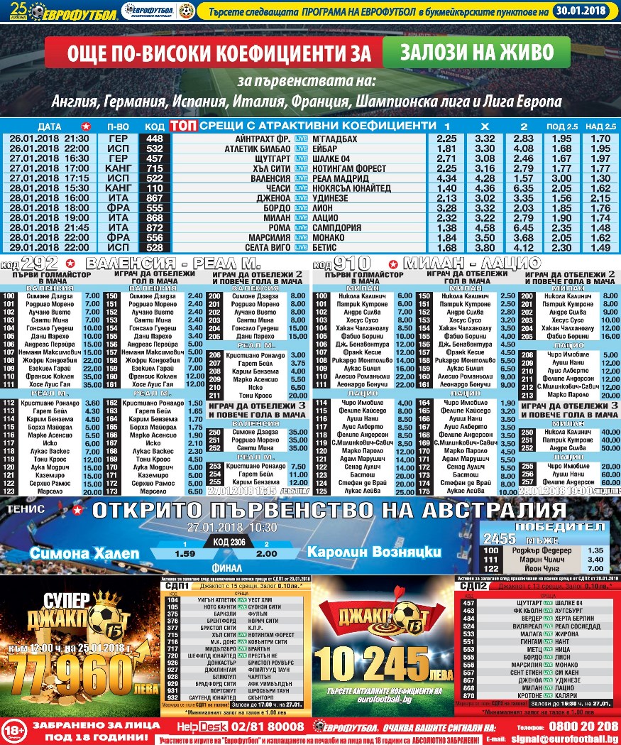 30-те срещи от МАКСГОЛ може да намерите тук. Суперджакпот 15 към 15.00 часа на 26.01.2018 г. е на стойност 78 041 лева, а срещите от него можете да намерите тук. Натрупаната сума в Джакпота с 13 срещи е 10 245 лева, а мачовете, с които можете да играете за него, ще откриете тук.