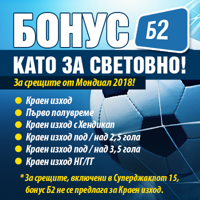 „Еврофутбол" предлага специални бонуси за Световното първенство по футбол при направени прогнози за 3 и повече мача. Кампанията е до 13 юни, като са включени предвиждания за Краен изход, Краен изход с ХК, ГГ/НГ, Под / Над 2,5 и 3,5 гола и Първо полувреме. В сайта новите бонуси са отбелязани в синьо с Б2, като правилата и процентите съответстват на настоящата бонус листа. Вижте срещите от Бонус 2 тук. За срещите, включени в Суперджакпот 15, бонус Б2 не се предлага за Краен изход.