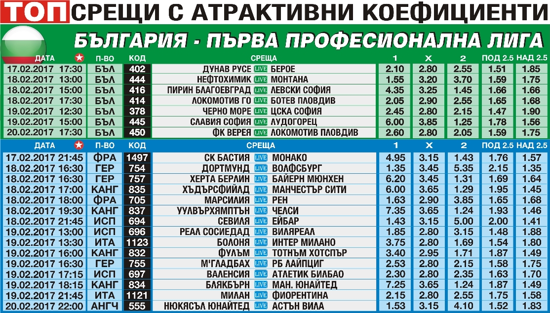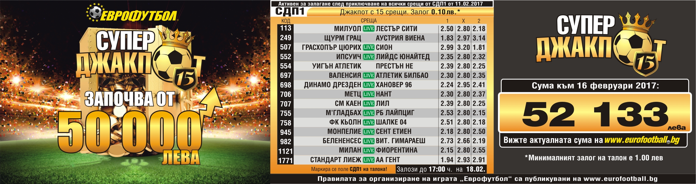 „Еврофутбол“ определи сумата от 52 133 лева за СУПЕРДЖАКПОТ 15, а всички срещи, които са включени в него можете да видите тук.