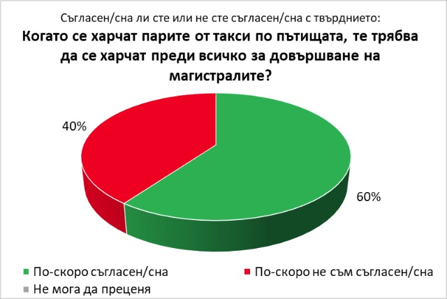 Запитаните са далече от експертиза по поставените въпроси, но мнозинство от 60% възприема идеята, че парите от новата система за таксуване по пътищата трябва да се дават приоритетно за довършване на магистралите. Това се дължи и на акцента върху магистралите, който се поставя в управленската философия в последните няколко мандата.