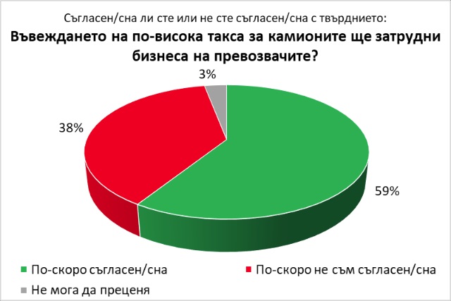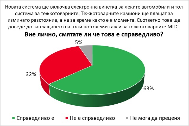 Запознати със спецификата на новата система, която включва по-високи такси за тежкотоварните превози, 63% намират този принцип за справедлив, а 32% - за несправедлив. Останалите се колебаят.