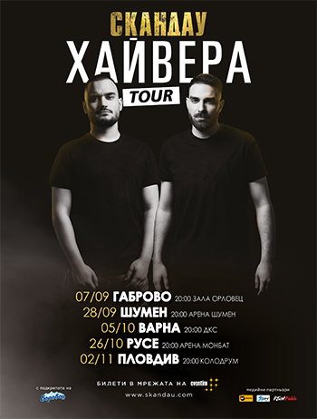 /КРОСС/ По - малко от месец остана до старта на турнето на група СкандаУ. Габрово е първия град, който ще посрещне Тото и Лъчо на 7-ми септември в зала Орловец от 20.00 часа. От днес, 21 август, до неделя е обявен СкандаУ Ticket Tour, в който билетите за всички градове от турнето ще се продават по 15 лева. Много игри вече стартираха с подарък билет за концерта, а феновете на групата, които пък си поръчат две тениски от SkandaUShop ще получат и един безплатен билет. Преди концертите също ще може да се купят техни тениски, на специално организиран за това щанд. Всеки ще може да си избере дизайн с култовите за СкандаУ фрази, а тениската му ще бъде изработена на място. Безспорно обаче, най-големия подрък, чакан от всички, които бяха в Арена Армеец на 6-ти април, е излъчването на концерта им. Той ще може да се гледа в YouTube канала на групата, а през уикенда по City TV.