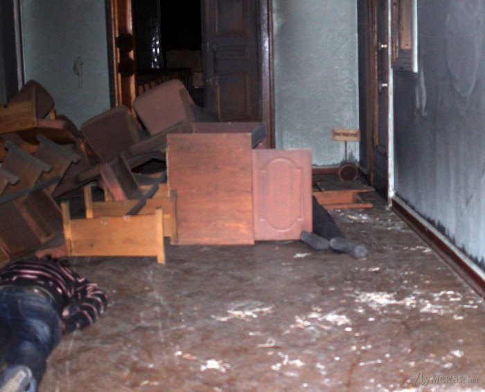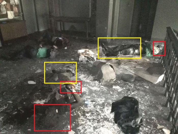 Горната снимка и долната са заснети под различен ъгъл. Обърнете внимание, че тук има дървени материали, които не са изгорели. Абсурдно е тези хора да са умрели на това място и причината да е била пожар. Парапета е дървен, радиатора не е обгорял, столове, маси от дърво не са били докоснати от огъня... Каква е тази барикада? Най-вероятно е направена за да блокират пътя към горните етажи на хората търсещи спасение от въоръжените и кръвожадни убийци, които са нахлули под прикритие...