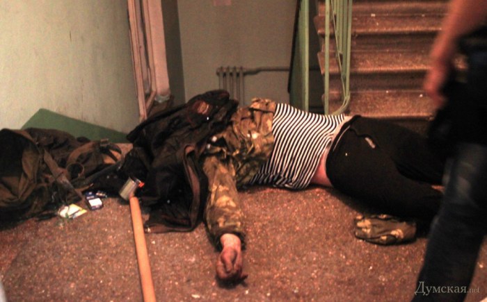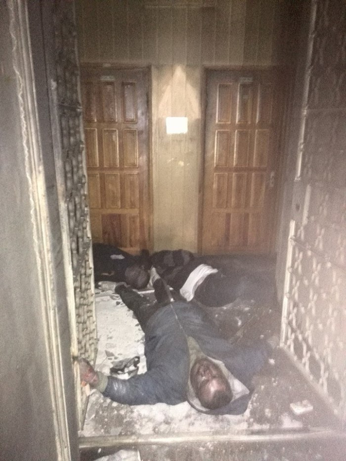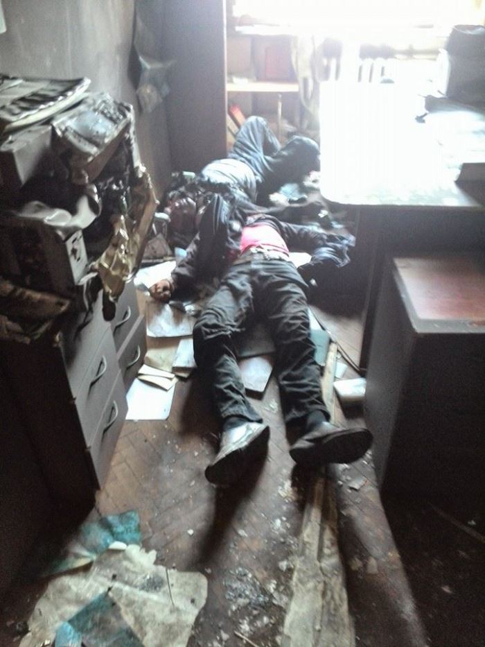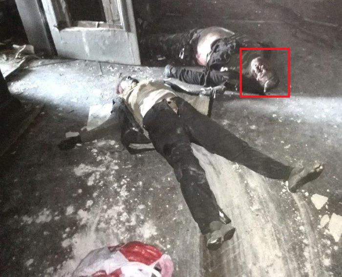 Дали е съвпадение? Дали убийците са си сменяли дрехите с убитите от тях? Това е древна и проста стратегия за заблуда. Барикадите са били по етажите, тук се вижда ясно. Също има и кръв на пода, също виждаме отново ясно и изгорената глава и длани. А разголения пояс е явно в следствие от бързото преобличане на труповете, от предварително накичените с про-руски лентички шпиони-убийци, които са се внедрили в сградата.