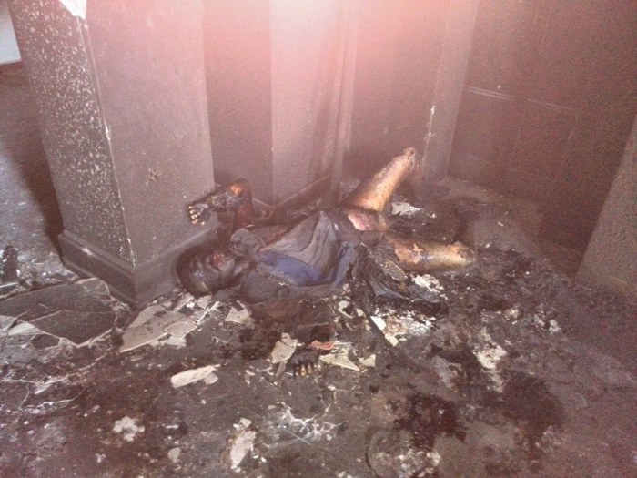 Защо ли не са се подпалвали дрехите? По ръцете до китките са горени до костта. На тази снимка, както и на другите снимки виждаме, че има странна бяла смес на пода. Какво е това? Това е прах от пожарогасители... били са ползвани за да загасят вече умрелите/убити, за да не загинат самите убийци от огъня.