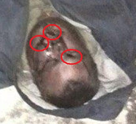Убит от изстрели в главата, в лицето, екзекуция. Вероятно застрелян 3 пъти, защото е бил едър мъж, тежък за да се преборят с него лесно извергите. Ето и огнестрелните рани отблизо: