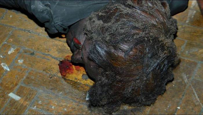 Погледнете следващата снимка, на женски труп, който е бил преместен от реалното място на смъртта. Вижте подлогата, следите. А на кого му е нужно да мести труповете, и защо?
