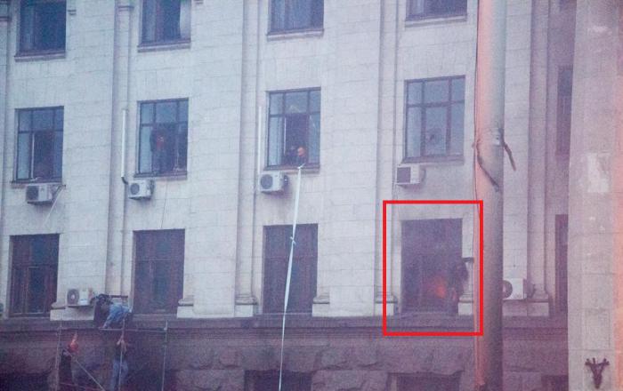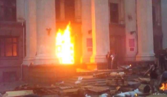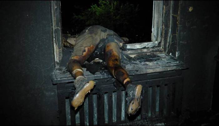 Как стана така, че пожара се прехвърли към вратите на сградата, в определен момент или сигнал? Хората, които се криели зад вратите на партерният етаж са били нападнати от екстремисти от „Десен сектор" и изгорени до кокал вътре. Първо са запалили едната масивна дървена врата...