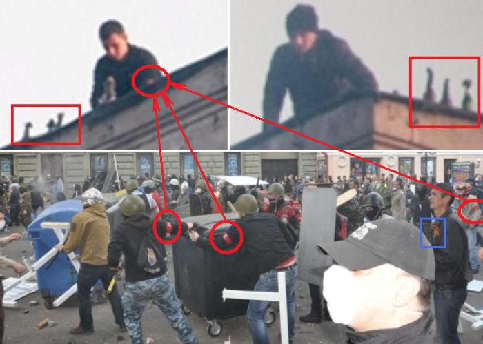 Точно така, това са приготвените от наемниците коктейли Молотов. Точно тези хора трябва да бъдат заловени. Виждаме им лицата, могат да бъдат открити и да бъдат накарани да кажат много неща за зверствата извършени срещу мирните граждани на Одеса. Но дали това ще се случи някога? Едва ли. Когато са замесени милиарди доларчета и евро, никой не се бърка. На долната част от снимката виждаме театъра в стил холивудски филм, за отклонение на вниманието - някои са накичени с лентичките на по-руски активисти (отбелязано в синьо)..