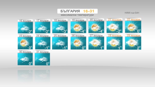 Следващата седмица от понеделник до четвъртък отново ще има условия за валежна обстановка в страната и превалявания от сняг. И отново за петък, събота и неделя очакваме да спрат и времето да се стабилизира. Температурите в низините ще си останат ниски, възможно е да има и мъгли, но в планините ще бъде по-приятно. Там очакваме да е предимно слънчево и с по-високи температури. През последните 2 дни на януари отново е възможно да завали- предимно сняг, на места в източните и южни райони-отново дъжд.