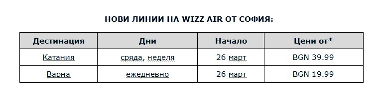 /КРОСС/Wizz Air, най-голямата нискотарифна авиокомпания в Централна и Източна Европа, и най-голям нискобюджетен превозвач в България, днес обяви нова линия от София до Катания на остров Сицилия, както и вътрешен маршрут, свързващ столицата с Варна, стартиращи от 26 март 2017. Полетите до Катания ще са два пъти седмично в сряда и неделя, а до Варна ще се обслужват ежедневно, на цени от BGN 19.99*.