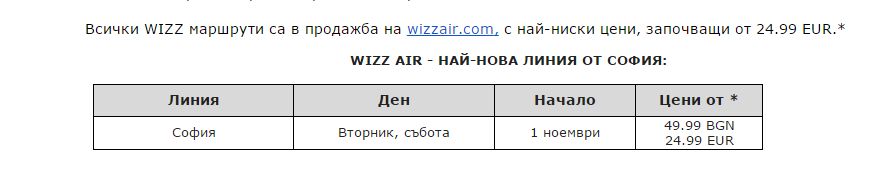 Wizz Air обслужва сега общо 38 линии до 17 държави, от 3 български летища: София, Варна и Бургас, предлагайки на клиентите от България най-широката нискотарифна мрежа, включвайки и вътрешен полет, който ще свързва София с Варна от 26 март 2017.