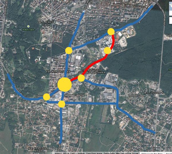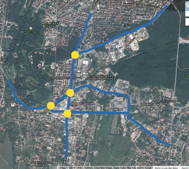 (фиг.3) Сегашната ситуация (големите пътни артерии са показани в синьо, а жълтите кръгове са местата на светофарите) с проблемните места и задръствания.