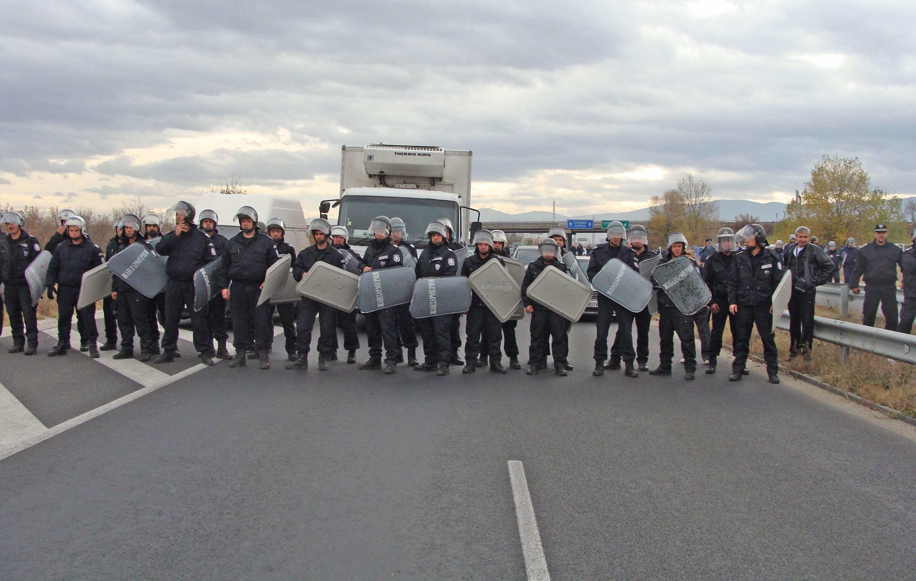 Служителите на жандармерията с щитове и каски застанаха пред колоната от автомобили и не разрешават на протестиращите да тръгнат към София.