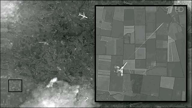 /КРОСС/ Уникална снимка от шпионски спътник показва как изтребител МиГ-29 е изстрелял ракета срещу сваления на 17 юли край Донецк малайзийски боинг. Снимката се появи за първи път в публицистичното предаване „Однако" („Обаче") на Първи канал на руската телевизия, излъчено в петък следобяд.