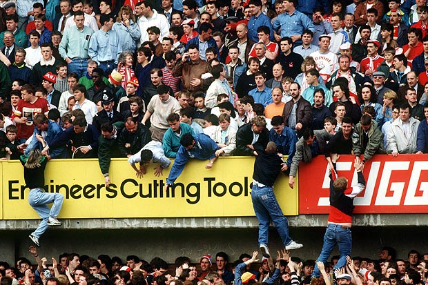 В 15:06 съдията спира мача, след като хората панически започват да прескачат оградите и да нахлуват на игрището. Единственият изход е към игрището. Малка част от оградата рухва и през пролуката се излива поток от задъхващи се хора, ранени и мъртви, докато други продължават да прескачат оградите.