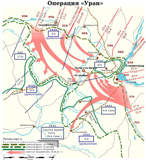 Сталинградската биткаРано сутринта на 19 ноември 1942 година, хиляди съветски оръдия обсипват позициите на нацистите със снаряди. Съветската армия започва решителна атака. Няколко дни по-късно 330 000 нацистки войници, офицери и генерали се оказват в обкръжението на съветските войски. Битката продължава 3 месеца, но всички опити на нацистите да разкъсат съветския пръстен са напразни.Съветските власти се подготвят от 2 месеца за тази решителна операция. Голям военен контингент, основно от Сибир, е концентриран при Сталинград. Участниците в Сталинградската битка я наричат „ада на Земята". Хълм в центъра на града, наречен Мамаев Курган, преминава няколко пъти последователно в ръцете на съветската армия и нацистите.Сталинградската битка продължава 200 дни. Историците казват, че това е най-голямото кръвопролитие в човешката история. Около 1 милион съветски военнослужещи са убити или ранени в тази битка, но нацистките загуби също са големи - те загубват около една четвърт от своята армия. Съветската стратегическа операция през Втората световна война, проведена на 19-23 ноември 1942 година, която води до обкръжаване на Шеста германска армия, Трета и Четвърта румънски армии, както и части от германската Четвърта бронетанкова армия, носи кодовото име „Операция Уран".На 19 ноември 2012 година са монтирани паметни плочи на мемориалния комплекс „За героите от Сталинградска битка" на Мамаев Курган в руския град Волгоград (бивш Сталинград). Още 1500 мемориални плочи с имената на повече от 17 000 защитници на града ще бъдат поставени на 100 метровата стена.