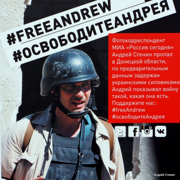 "За съжаление, съдбата на тези, чиито кинопрегледи и снимки оживяват за нас отминалата епоха и това, което се случва в наши дни, е много драматична. Днес ние се притесняваме за фотографа на МИА "Россия сегодня" ("Русия днес") Андрей Стенин, който изчезна в Украйна, и се надяваме, че той ще се върне у дома си", - каза Медведев на откриването на изложбата „Погледни войната в очите" в Москва.