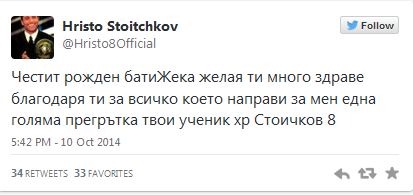 "Честит рожден батиЖека желая ти много здраве благодаря ти за всичко което направи за мен една голяма прегрътка твои ученик хр Стоичков 8", гласи туитът на Стоичков.