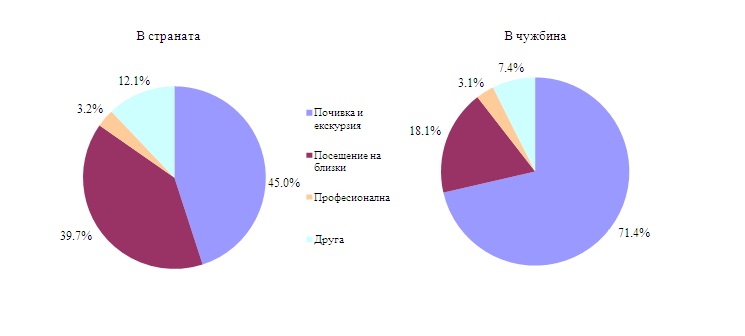 По-голямата част от туристическите пътувания на лицата на възраст 15 и повече навършени години както в страната, така и в чужбина са били с цел „почивка и екскурзия", посочени съответно от 45.0 и 71.4% от тях (фиг. 3).