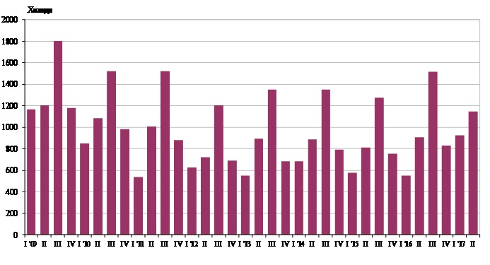 Фиг. 7. Среден разход за професионални пътувания на лице по тримесечия