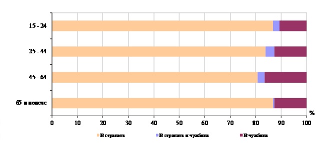 През второто тримесечие на 2017 г. най-много туристически пътувания са реализирани от българите на възраст 25 - 44 години (43.5% от всички пътували лица). Във всички възрастови групи преобладава относителният дял на пътуванията в страната, като най-висок е този дял при лицата на възраст 65 и повече навършени години - 86.8% от пътувалите в тази възрастова група. При пътуванията в чужбина делът на пътувалите лица на възраст 45 - 64 години е най-голям - 16.5% от пътувалите в съответната възрастова група (фиг. 2).