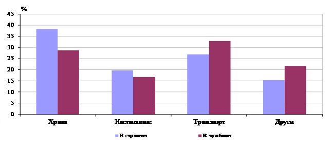 В структурата на разходите по видове с най-голям относителен дял в страната са тези за храна - 38.2%, докато в чужбина са разходите за транспорт - 32.9% (фиг. 5).